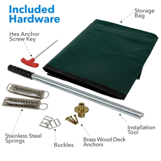The Yard Guard Aquamaster is a lightweight solid safety cover that is up to 50% lighter than conventional vinyl solid covers but is also up to 70% stronger. This tough, non-porous material blocks sunlight and helps prohibit algae growth, plus the durable coating will not fade or stain. Safety covers are a premium option for swimming pool owners who are looking for a great looking product that will keep unwanted intruders from entering their swimming pool. Yard Guard safety covers are manufactured with the highest standards in the industry and are designed to keep your pool safe and clean. This cover is reinforced with extra heavy-duty webbing along the top and bottom of every seam. Unlike other safety covers, which feature webbing on only one side of the cover, Yard Guard's webbing on both sides increases the strength of the cover by double. Rub strips are placed where the strapping would go over the coping to prevent wear and tear. Marine-grade heavy-duty white triple line stitching is used to secure all straps with cross and box tack at all perimeter stress points. All Yard Guard covers are manufactured using the most modern equipment, including a computerized cutting and shaping system. All covers, throughout every stage of production, are quality checked and signed for before final packaging. The hardware included with this cover is prepackaged in individual poly bags, each containing a brass plug, brass screw, spring, buckle, and vinyl sleeve.