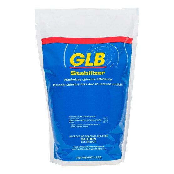 GLB Chlorine Stabilizer will cut chlorine loss caused by sunlight. Customers save money when they use GLB Chlorine Stabilizer. If you use GLB Chlorine Stabilizer you can cut chlorine consumption by up to 25%. GLB Chlorine Stabilizer will help sustain ongoing chlorine residual. Add this product to your pool in the spring, and you will improve chlorine effectiveness all season long. Contains 100% Cyanuric Acid.