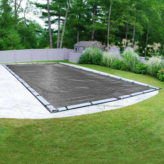 Protect your in-ground swimming pool with the Pool Mate Ultimate solid winter pool cover. The polyethylene material, which does not allow water to pass through, is constructed with a 14x14 scrim (threads per square inch). Covers with a higher scrim will have a better overall quality, strength, and durability. The material weighs 5.2 ounces per square yard which is important because heavier covers will be affected less by extreme elements. The topside of this cover has been treated to inhibit UV rays and the bottom of the cover is black to help prevent algae growth. This cover has an additional five foot overlap to ensure space for water bags on the deck and slack in the cover. A 2 inch marine-grade nylon binding boarders the entire cover providing enhanced protection from wear and tear. Water bag loops made of the same nylon binding are placed every four feet around the perimeter of the cover. The Pool Mate Ultimate comes in multiple colors (depending on pool size and availability) and is covered by a twenty-year warranty.