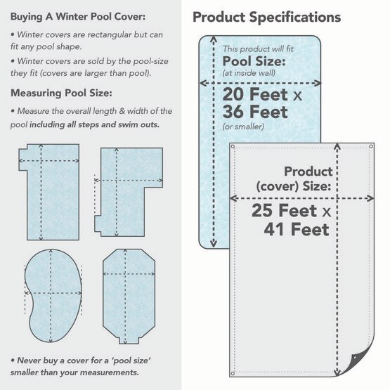 Protect your in-ground swimming pool with the Pool Mate Dura-Guard solid winter pool cover. The polyethylene material, which does not allow water to pass through, is constructed with a 8x8 scrim (threads per square inch). Covers with a higher scrim will have a better overall quality, strength, and durability. The material weighs 2.36 ounces per square yard which is important because heavier covers will be affected less by extreme elements. The topside of this cover has been treated to inhibit UV rays and the bottom of the cover is black to help prevent algae growth. This cover has an additional five foot overlap to ensure space for water bags on the deck and slack in the cover. Two lines of double chain stitching secure the self-edged binding as well as water bag loops which are placed every four feet around the perimeter of the cover. The Pool Mate Dura-Guard comes in multiple colors (depending on pool size and availability) and is covered by a ten-year warranty.
