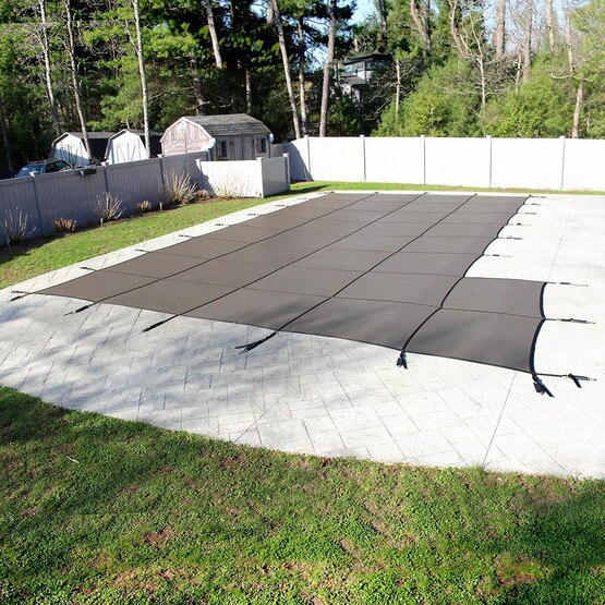 Yard Guard safety covers are manufactured with the highest standards in the industry and are designed to keep your pool safe and clean. This cover is reinforced with heavy-duty webbing along the top and bottom of every seam. Unlike other safety covers, which feature webbing on only one side of the cover, Yard Guard's webbing on both sides increases the strength of the cover by double. Rub strips are placed where the strapping would go over the coping to prevent wear and tear. Marine-grade white triple line stitching is used to secure all straps with cross and box tack at all perimeter stress points. The Yard Guard BLOC Mesh 99% safety cover features a 99% shade rated, heavy-duty, porous mesh. Shade rating is the percentage of sunlight the cover blocks from entering your pool. The more sunlight that is blocked by the cover, the less algae that will be able to grow in your pool. This mesh also features a 58 x 48 scrim count (threads per square inch), which is a measure of how tightly woven the material is. The material used is also 7.1 oz/yd2 and 18 mills thick. All Yard Guard covers are manufactured using the most modern equipment, including a computerized cutting and shaping system. All covers, throughout every stage of production, are quality checked and signed for before final packaging. The hardware included with this cover is prepackaged in individual poly bags, each containing a brass plug, brass screw, spring, buckle, and vinyl sleeve.