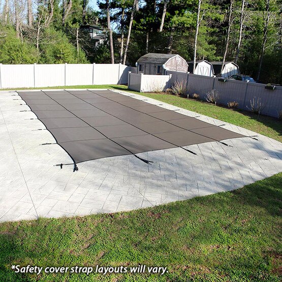 The Yard Guard Aquamaster is a lightweight solid safety cover that is up to 50% lighter than conventional vinyl solid covers but is also up to 70% stronger. This tough, non-porous material blocks sunlight and helps prohibit algae growth, plus the durable coating will not fade or stain. Safety covers are a premium option for swimming pool owners who are looking for a great looking product that will keep unwanted intruders from entering their swimming pool. Yard Guard safety covers are manufactured with the highest standards in the industry and are designed to keep your pool safe and clean. This cover is reinforced with extra heavy-duty webbing along the top and bottom of every seam. Unlike other safety covers, which feature webbing on only one side of the cover, Yard Guard's webbing on both sides increases the strength of the cover by double. Rub strips are placed where the strapping would go over the coping to prevent wear and tear. Marine-grade heavy-duty white triple line stitching is used to secure all straps with cross and box tack at all perimeter stress points. All Yard Guard covers are manufactured using the most modern equipment, including a computerized cutting and shaping system. All covers, throughout every stage of production, are quality checked and signed for before final packaging. The hardware included with this cover is prepackaged in individual poly bags, each containing a brass plug, brass screw, spring, buckle, and vinyl sleeve.