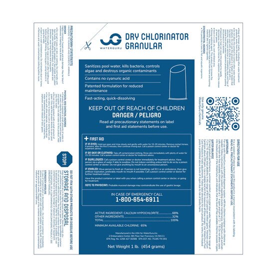 WaterGuru Powdered 68% Calcium Hypochlorite Shock is an extra-powerful start-up and maintenance shock that helps to improve the appearance of your pool by removing and preventing algae growth. WaterGuru Powdered Shock removes organic waste and raises chlorine level, producing sparkling, clean swimming pool water. Kills bacteria, controls algae, destroys organic contaminants and restores crystal clarity. This is the ideal product for a super-fast acting chlorine boost to give your pool shocking clarity. DIRECTIONS FOR USE: This shock is to be dispersed in the pool water. WARNING: Not intended for us in any type of chlorinator. Available and packaged in 1 LB bags.